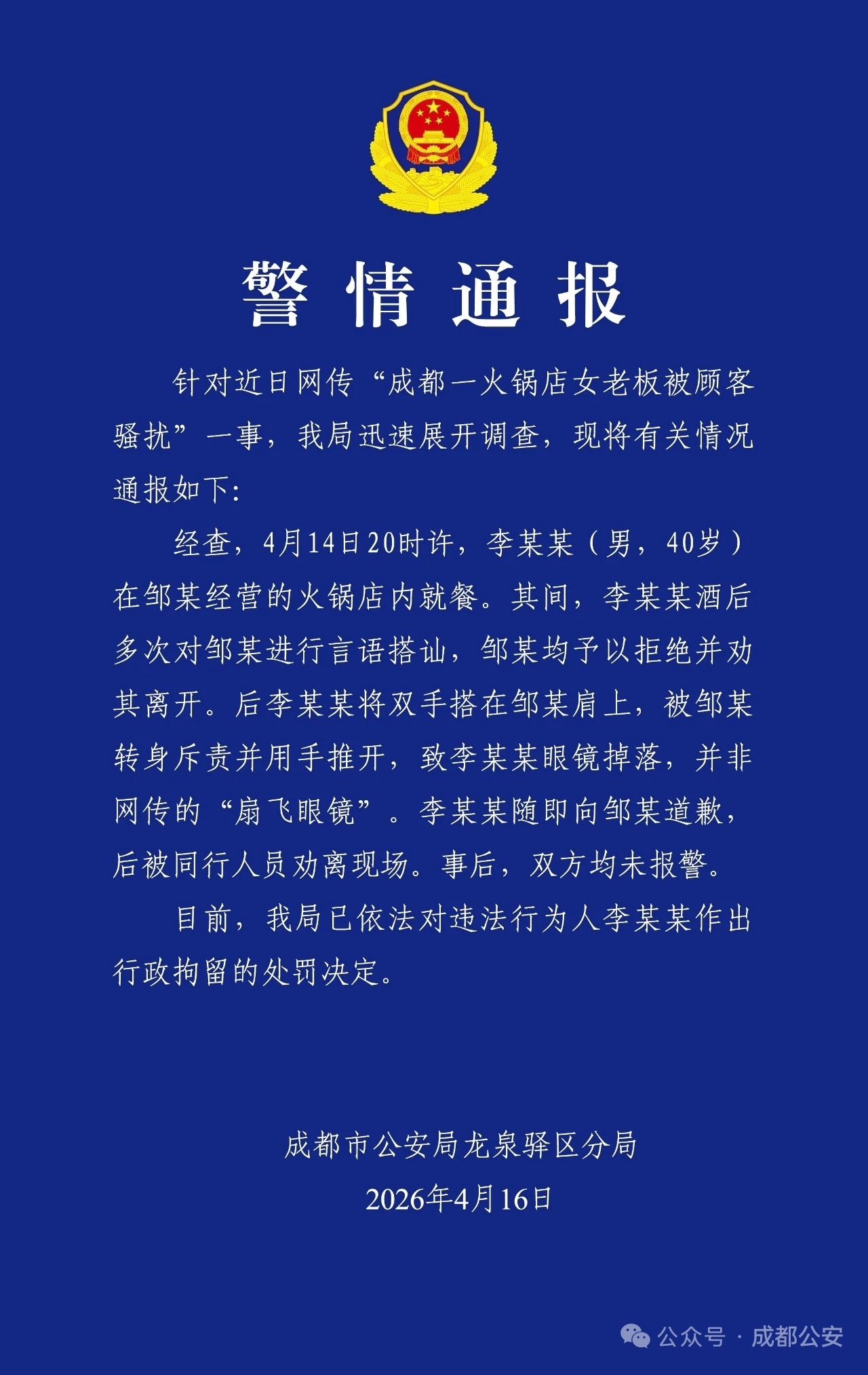4月14日20时许,40岁的李某某在成都龙泉驿区一家火锅店就餐。其间,李某某酒后多次对店主邹某进行言语搭讪,并邀约对方喝酒,还自称是主播公司人员,想要捧邹某做女主角。邹某多次明确拒绝,并试图委婉劝其离开,可李某某仍持续纠缠,甚至从身后将双手搭在邹某肩上。